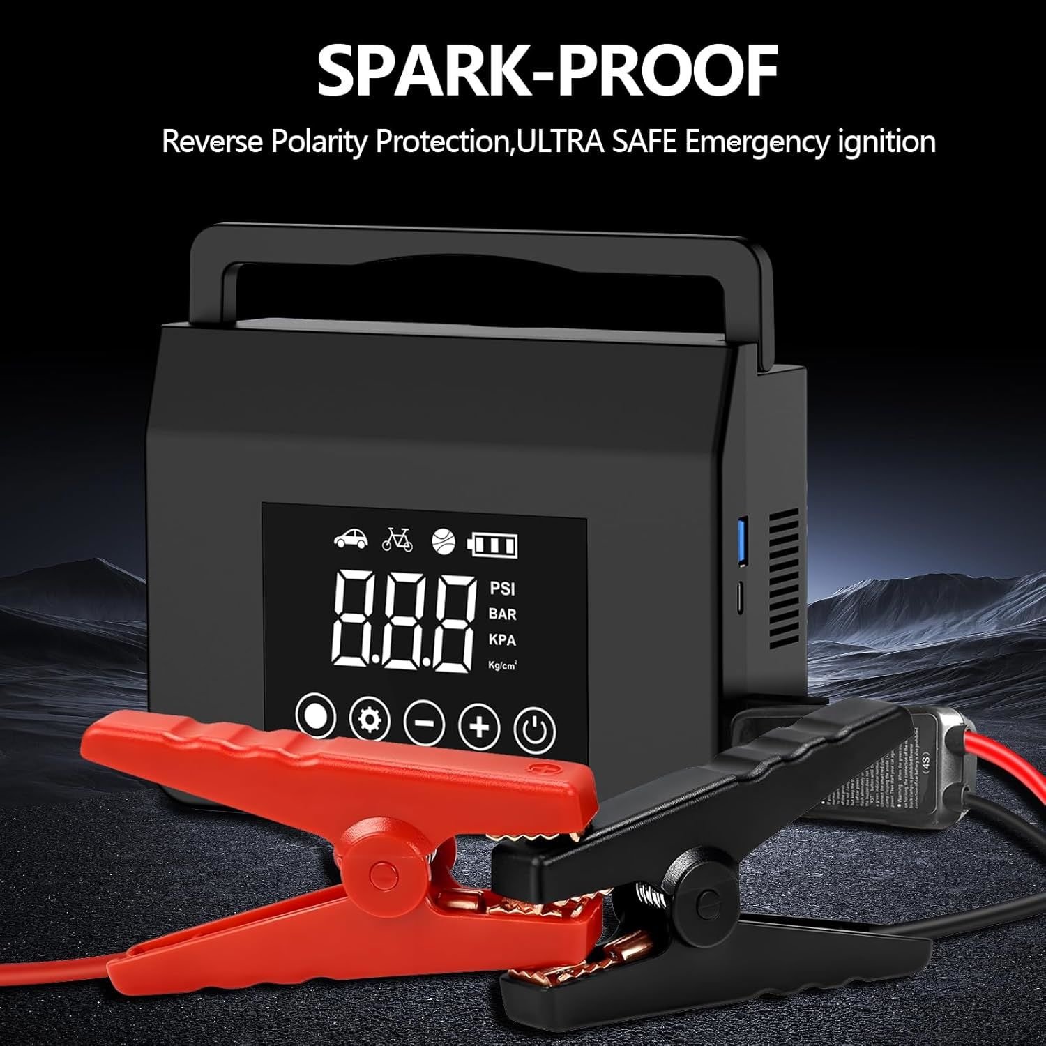 • [Smart Cordless Inflator with LCD Display]The car jumper starter supports smart preset & auto shut-off without repeated adjustment and check. With unique turboch
